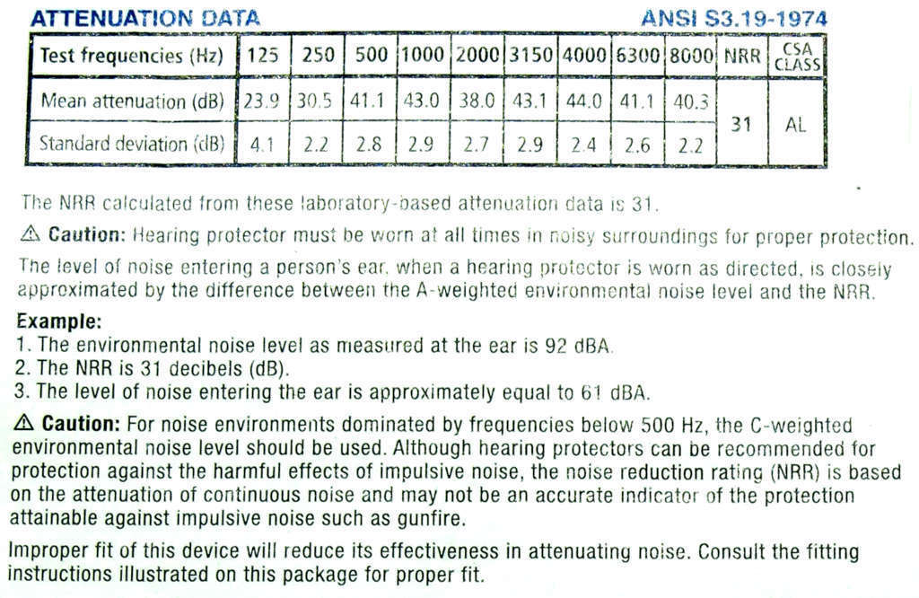 In addition to the NRR, earplugs and earmuffs are accompanied by an attenuation table detailing by how much they reduce noise at different frequencies. This table comprises actual test results and is the basis for the calculation of the NRR.